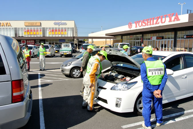 マイカー無料点検は、スーパーの駐車場内に点検コースを準備して実施しました。支部の会員(整備士)らがお客様の愛車を1台ずつ順番に対応しながら、自動車ユーザーの方に義務付けされている「日常点検」の手順を分かりやすく説明しました。その後、会員(整備士)が、エンジンルーム内やタイヤ、ランプ類などを点検しました。